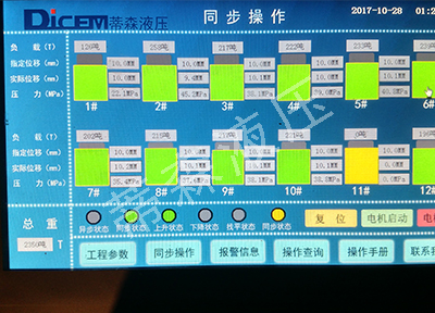 西溪大橋,位于福建省漳州市龍海市橫跨九龍江,是福建省道漳云線和國道324線的連接段,該大橋全長2820米,于03年開始動(dòng)工修建。由于該大橋每日車流量大,修建時(shí)間之長,所處的水文環(huán)境特殊,于2017年10月間,保障交通大通暢,對大橋?qū)嵤﹩蜗蝈e(cuò)開封閉,進(jìn)行橋梁加固和路面檢修作業(yè)和橋梁頂升應(yīng)力釋放,原計(jì)劃分別對14號(hào)、17號(hào)橋墩進(jìn)行單次同步頂升作業(yè)。福建路橋集團(tuán)在反復(fù)的勘測和檢測后,確定需要對九龍江中心處150米標(biāo)段的橋面同步整體提升10mm懸空。由于14號(hào)和17號(hào)橋墩所處九龍江江中,水文環(huán)境變化大,白晝潮汐變化大,對橋墩應(yīng)力釋放有著苛刻的溫度把控要求,戶外溫度必須在18度左右。由于兩個(gè)橋墩之間跨度達(dá)到150米。原來的8點(diǎn)位的PLC同步頂升系統(tǒng)點(diǎn)數(shù)和油管及數(shù)傳信號(hào)線長度無法滿足現(xiàn)有的要求。在更換設(shè)備后。用12點(diǎn)位的PLC同步頂升系統(tǒng)替換原來的8點(diǎn)位PLC系統(tǒng),液壓千斤頂數(shù)量從原來的10臺(tái),增加到目前的22臺(tái)。油路及管線的布置,采用6點(diǎn)位分布,每個(gè)點(diǎn)位并聯(lián)兩至三個(gè)千斤頂達(dá)到承重均布。一個(gè)點(diǎn)位由一個(gè)脈沖位移傳感器進(jìn)行檢測。經(jīng)過一系列的準(zhǔn)備和調(diào)試工作,頂升作業(yè)于10月28日晚,凌晨一點(diǎn),對14號(hào)和17號(hào)橋墩進(jìn)行橋梁同步提升作業(yè)。隨著各單位的協(xié)調(diào)配合,頂升作業(yè)進(jìn)行了半個(gè)小時(shí)就完成了,橋墩應(yīng)力釋放。整過頂升作業(yè)過程進(jìn)展順利,各項(xiàng)技術(shù)參數(shù)達(dá)到預(yù)期要求。