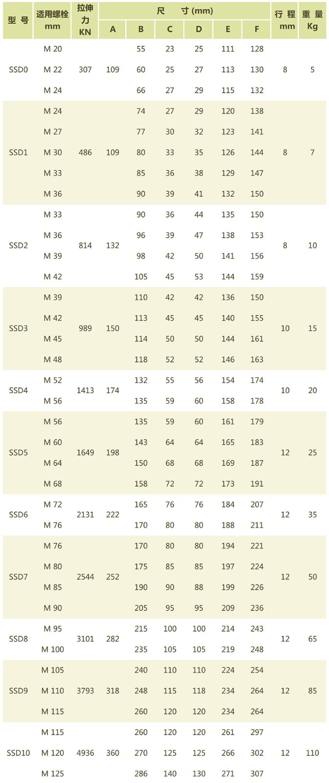 SSD單級液壓螺栓拉伸器選型表