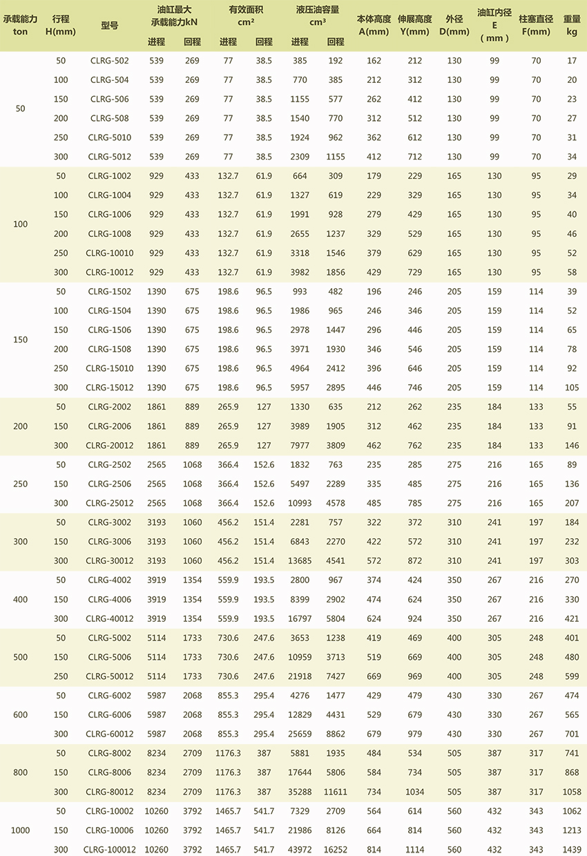CLRG大噸位雙作用液壓千斤頂選型表