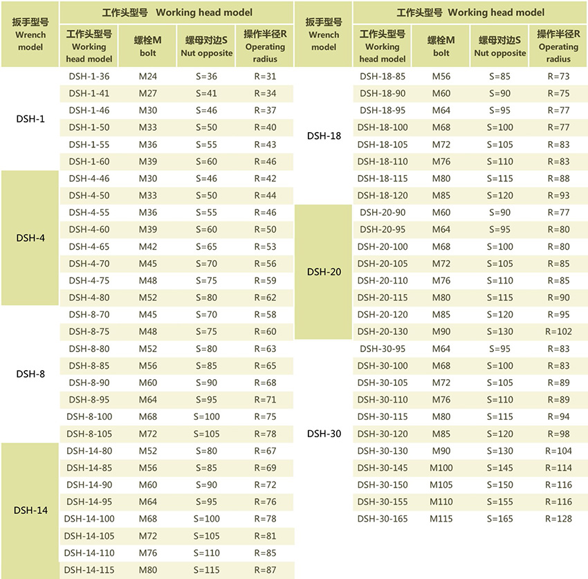 產品特點 每個型號的DSH中空扭矩扳手動力頭都有一整套的工作頭與之對應 涵蓋該型號的動力頭所能提供所有尺寸的螺栓 在選擇工作頭時,注意螺栓與障礙物的距離要大于工作頭的操作半徑 同時也要注意螺栓與螺栓之間是否有足夠空間 下表中操作半徑R能幫助您選擇到合適的工作頭 變徑套筒配合DSH系列工作頭使用 使得單一的工作頭能配合多種不同規格的螺栓,大大提高適應性 注:我們可以根據客戶要求定制特殊工作頭